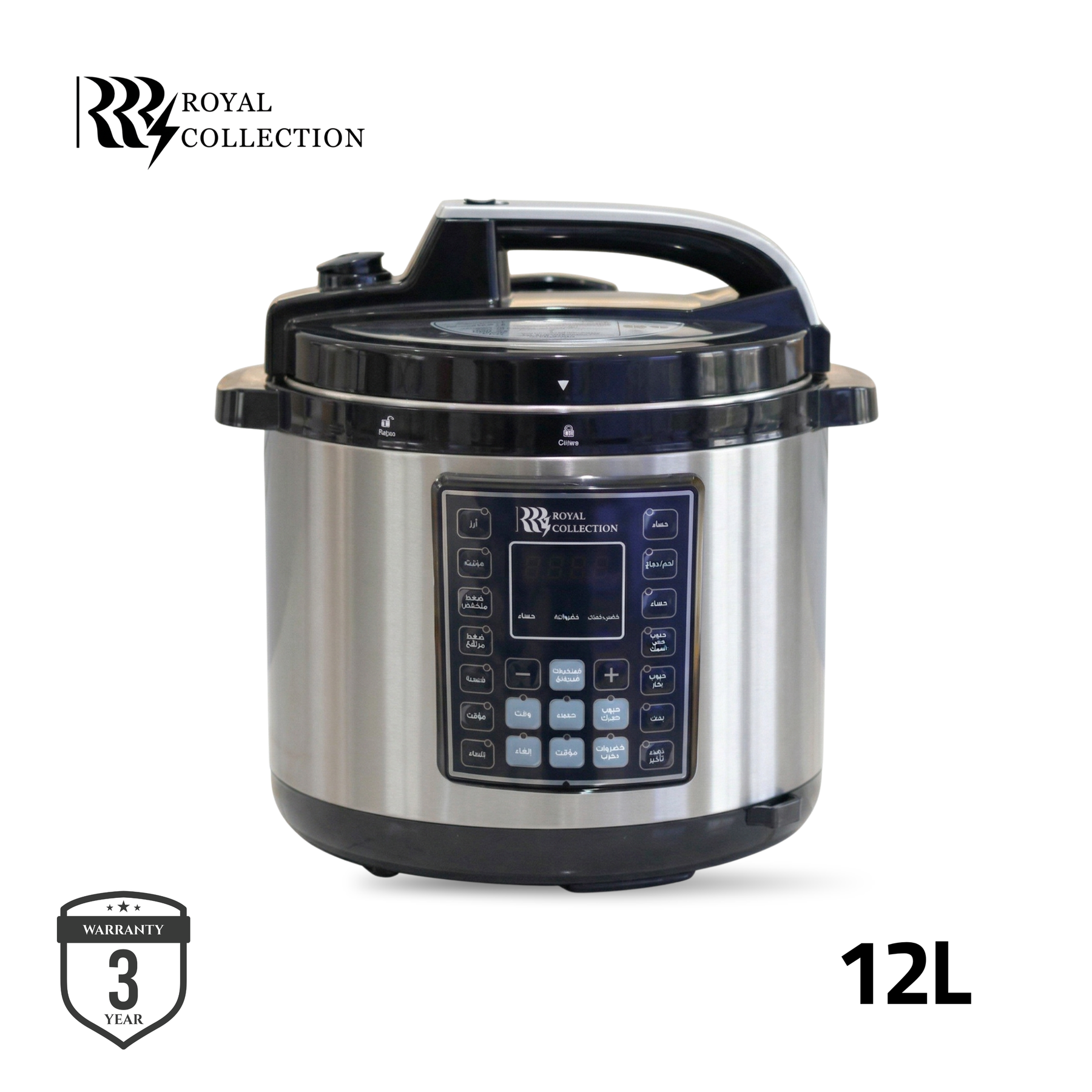 طنجرة الضغط الكهربائية من Royal بسعة كبيرة 12 لتر هي الخيار المثالي للعائلات الكبيرة والعزائم، حيث توفر لك طبخ سريع وذكي بكل سهولة.تحتوي على 13 برنامج طبخ متنوع تشمل الدجاج، اللحوم، السمك، الفاصولياء، والقوليات، بالإضافة إلى إمكانية الطهي على البخار وتحضير جميع أنواع الخضروات.