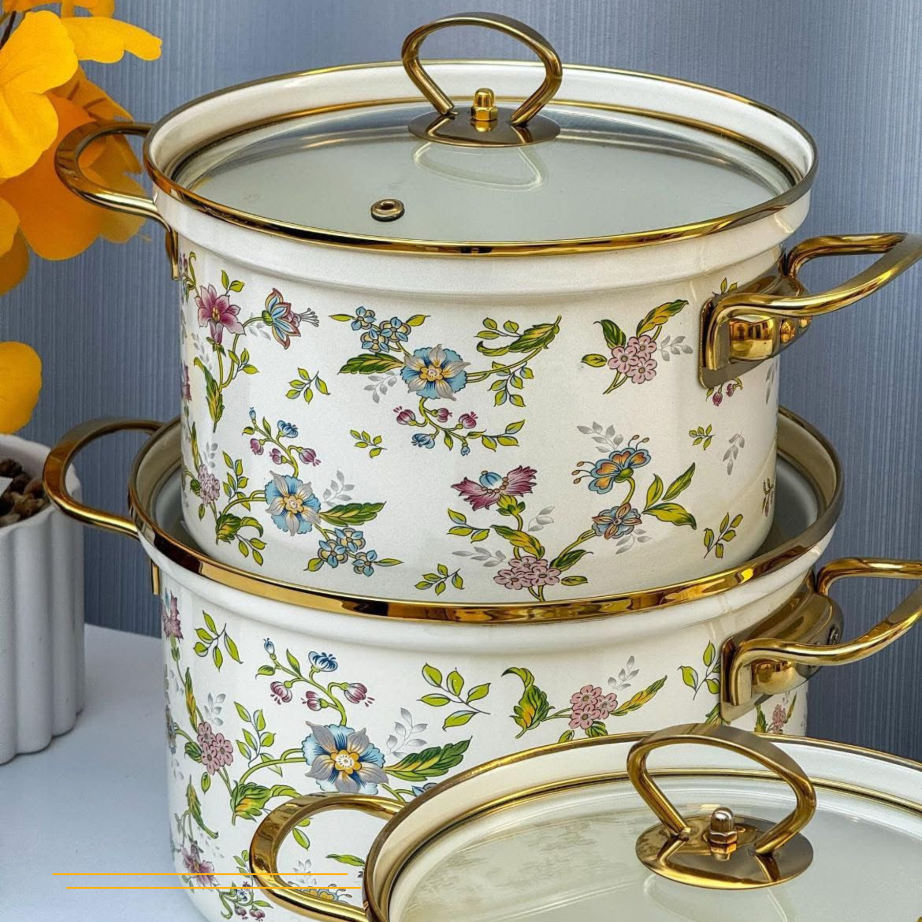 أضف لمسة من الأناقة إلى مطبخك مع مجموعة الأواني الفاخرة هذه المصنوعة من الستيل المطلي بالمينا (القيشاني)، والتي تتميز بتصميم عصري وألوان زاهية تضفي الأناقة على تجربة الطهي الخاصة بك. كل وعاء يأتي مع غطاء زجاجي مقاوم للحرارة، مما يتيح لك مراقبة طهيك بسهولة.
