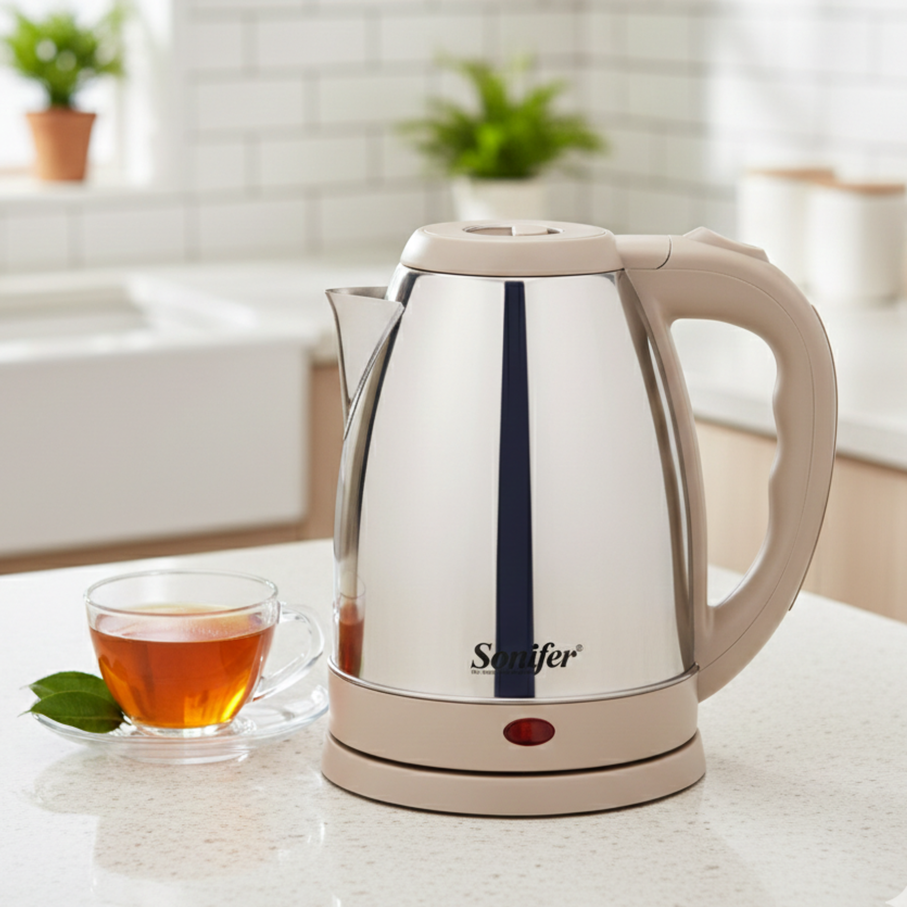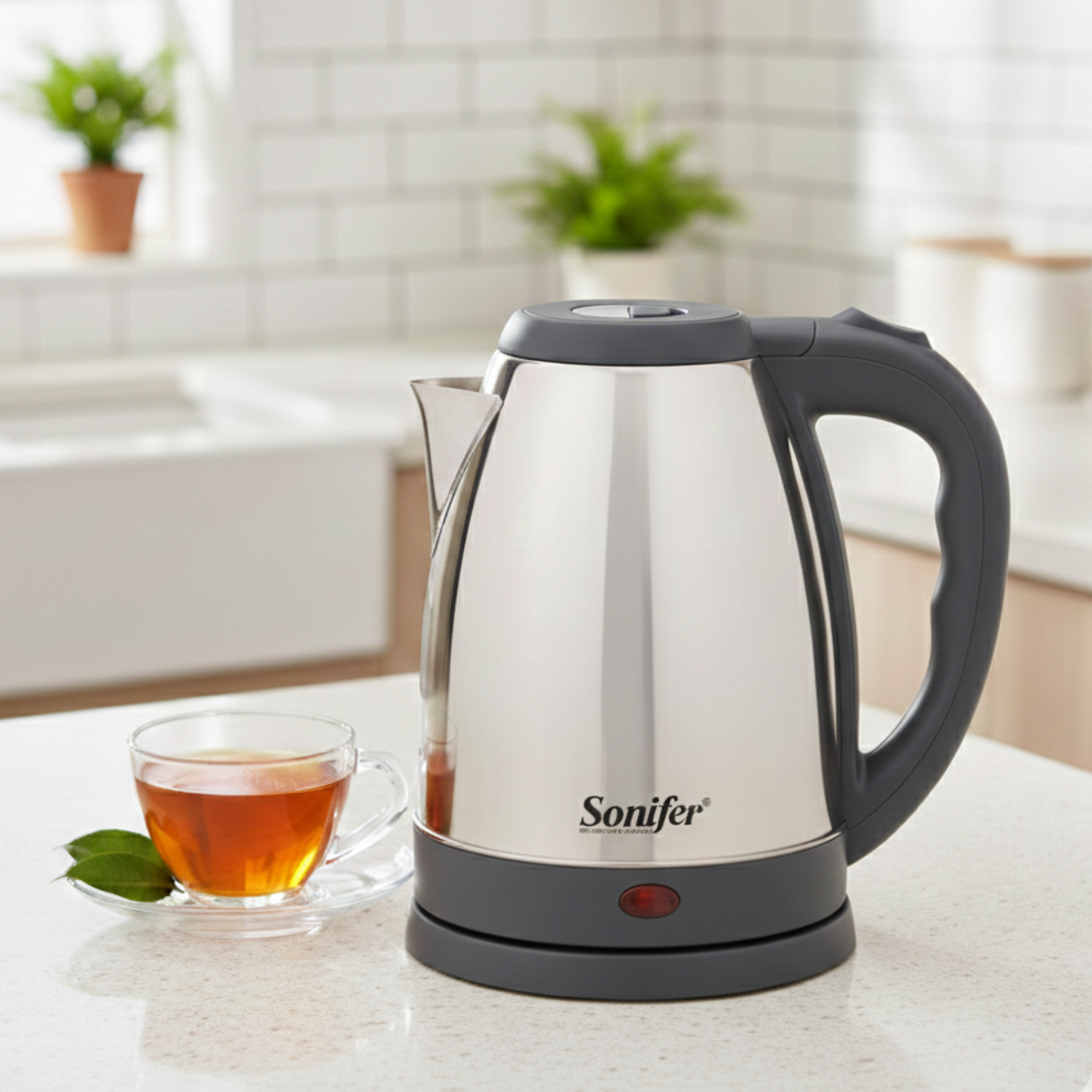 سخان كهربائي من Sonifer سعة 1.8 لتر، قوة 1500 واط، مصنوعة من الستانلس ستيل المتين غليان السريع وامن. مثالية لتحضير الشاي والقهوة والمشروبات الساخنة. مصممة مع إيقاف تلقائي للتشغيل الآمن.