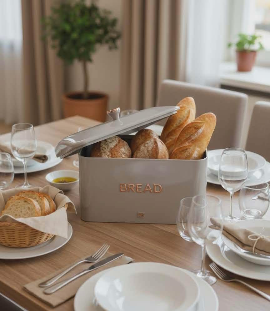 يحمي الخبز من الرطوبة والهواء، مما يساعد في الحفاظ على نضارته وطعمه وملمسه. مع حجمه الواسع، يمكنه تخزين أنواع مختلفة من الخبز بينما يضيف مظهرًا عصريًا ومنظمًا لسطح مطبخك.