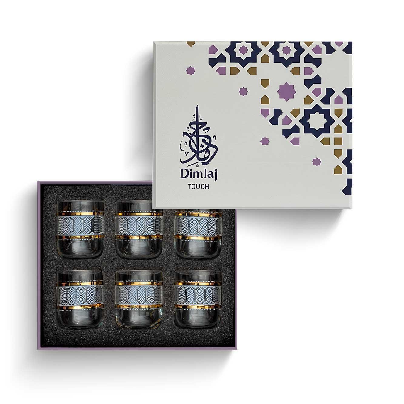 Dimensions: Diameter: 70 mm, Capacity: 280 cc, Height: 88.5 mm Brand: Dimlaj Touch Collection: Trails Precious Materials: Gold No. of Pcs: 6 pcs Material: Glass Packing Type: Luxury Gift Box Weight