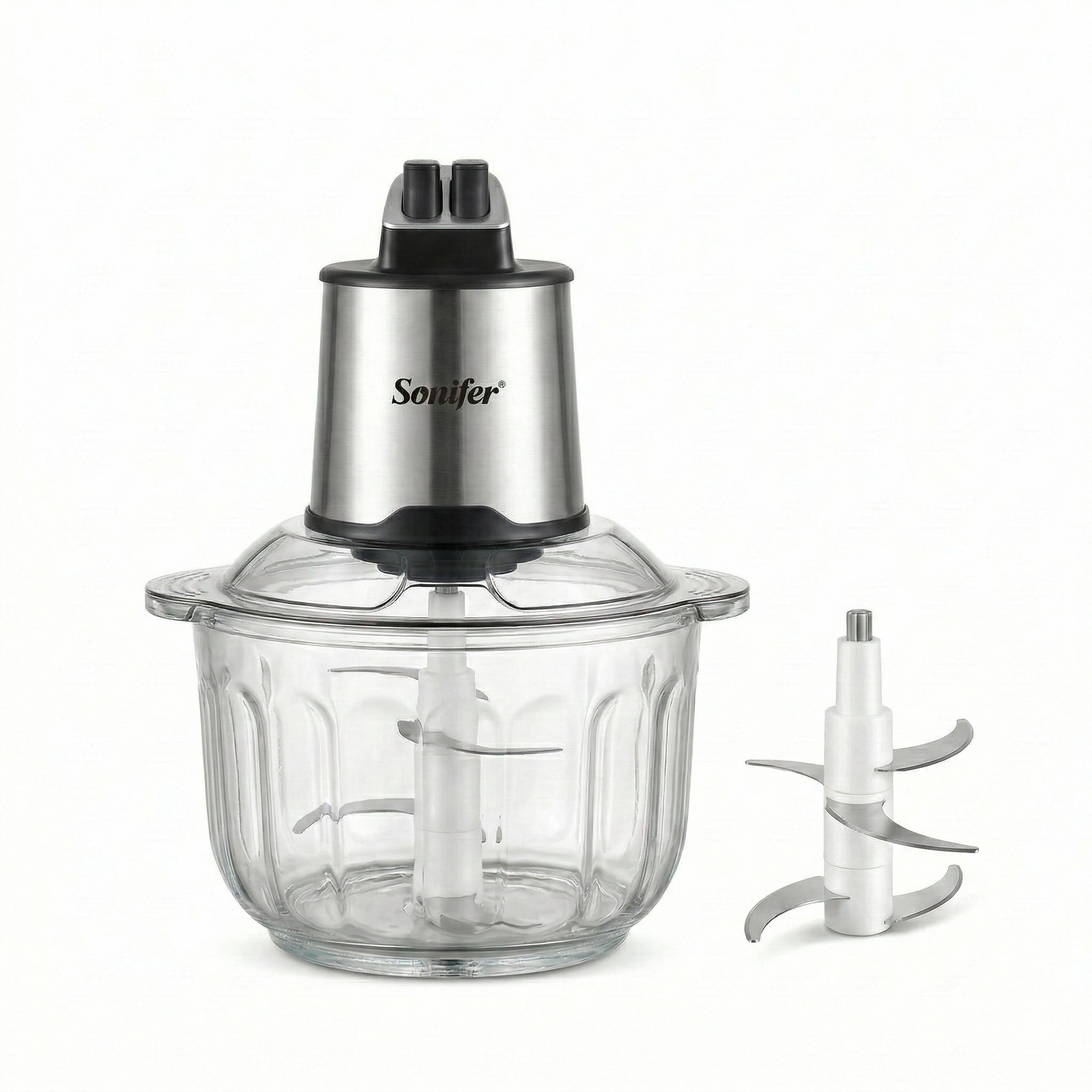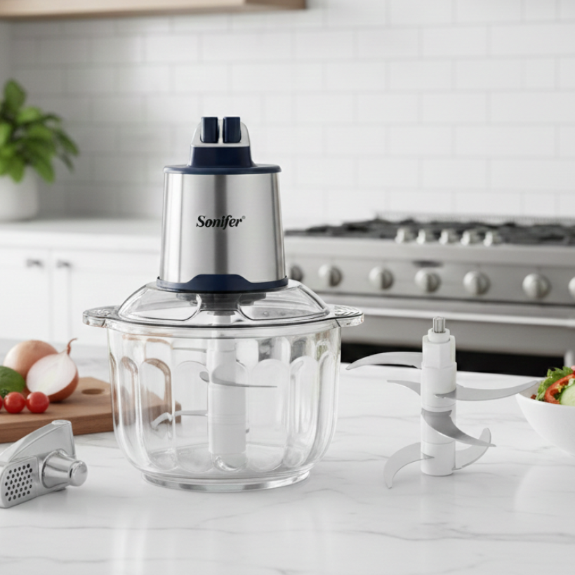 A powerful electric food chopper with a 600W motor and a large 4L glass bowl, designed for efficient chopping of vegetables and meat. Features two-speed control for easy operation and better performance with different ingredients.