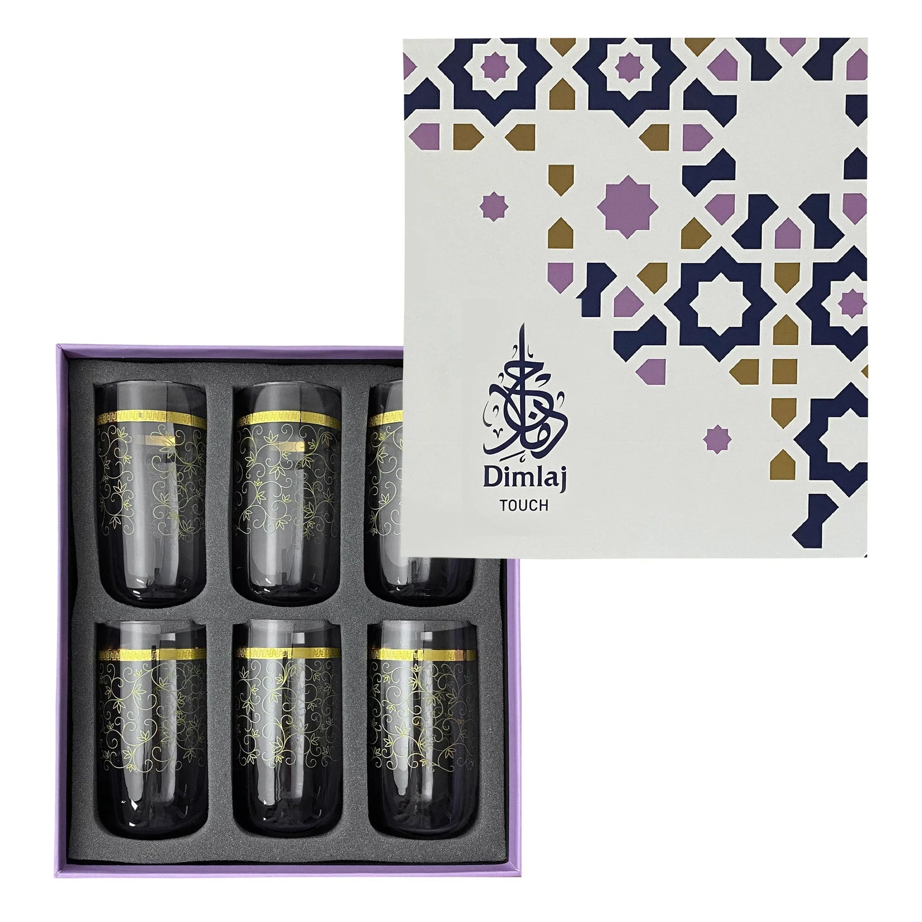 Dimensions: Diameter: 67 mm, Capacity: 365 cc, Height: 129 mm Brand: Dimlaj Touch Collection: Tendri Precious Materials: Gold No. of Pcs: 6 pcs Material: Glass Packing Type: Luxury Gift Box Weight